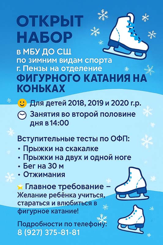 МБУ ДО «Спортивная школа по зимним видам спорта города Пензы проводит набор детей на отделение фигурного катания на коньках.